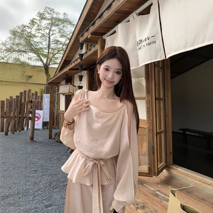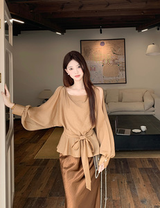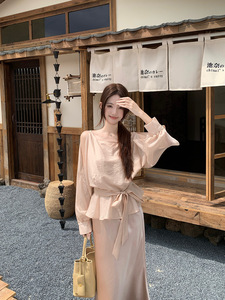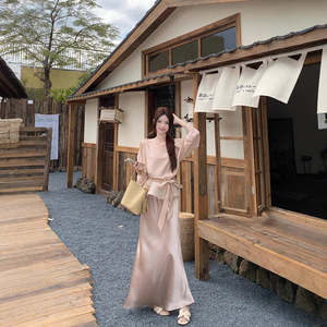 实拍 2025韩系千金早秋设计感长袖系带上衣女+缎面长款半身裙套装