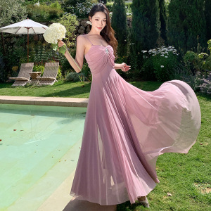 法式温柔紫色网纱一字肩吊带连衣裙女夏高级感收腰宴会礼服长裙子
