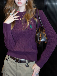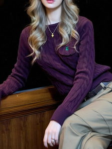 法式紫色圆领针织衫2025早秋季修身绞花刺绣长袖毛衣上衣