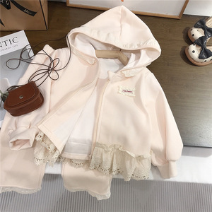森系女童秋季韩版小香风新款粉色蕾丝拼接连帽卫衣花边阔腿裤套装