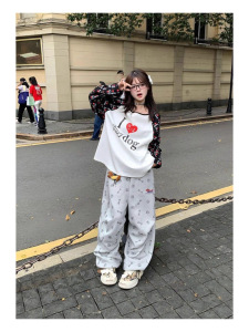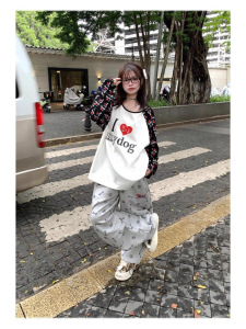 美式复古爱心狗爪拼色长袖T恤女辣妹露肩显瘦百搭打底衫上衣