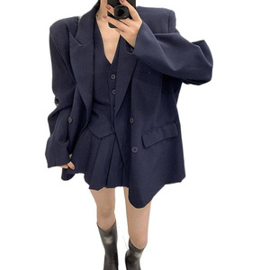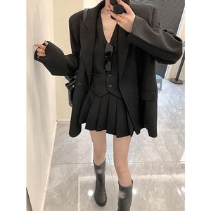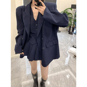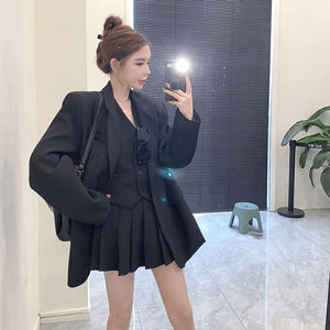 韩系宽松西装外套v领马甲背心高腰百褶裙三件套女春秋季时尚套装