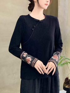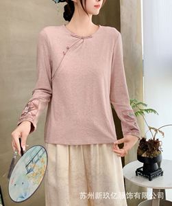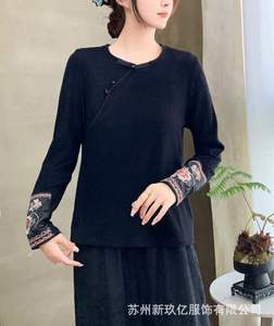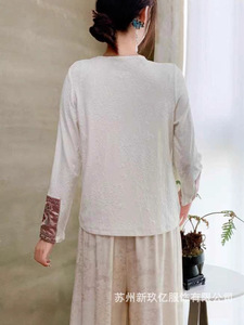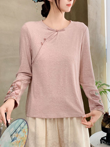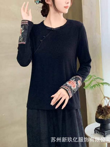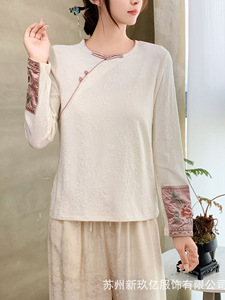 新中式圆领提花打底衫女2025秋季新款文艺时尚宽松长袖T恤衫上衣