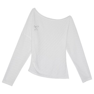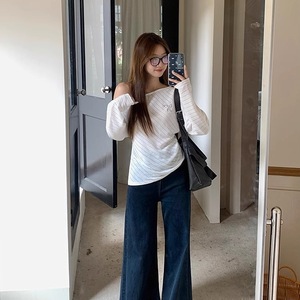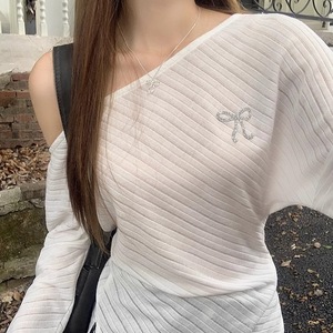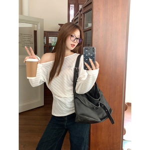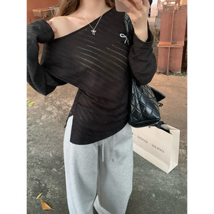 【实价】 纯欲斜肩针织长袖T恤女早秋宽松罩衫不规则露肩上衣
