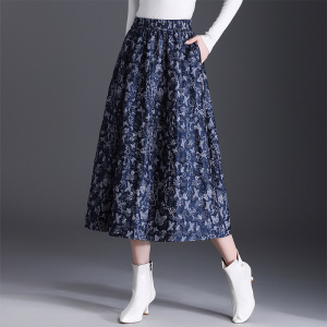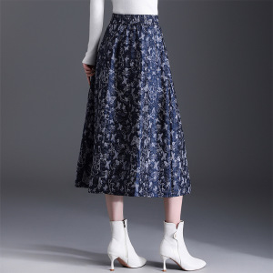 松紧高腰半身裙时尚蓝色蝴蝶花裙中长款女装优雅A字裙