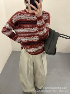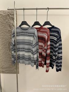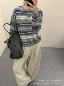 琪镌绘制圆领条纹针织毛衣女装宽松慵懒风韩版长袖打底上衣98306
