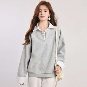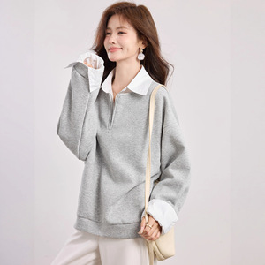 实拍 灰色假两件长袖衬衫卫衣女春秋款宽松无帽套头polo翻领上衣