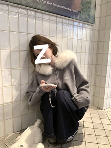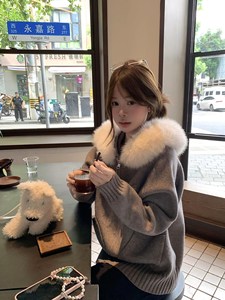美式复古慵懒风灰色毛领外套连帽针织开衫女秋冬季小个子外搭上衣