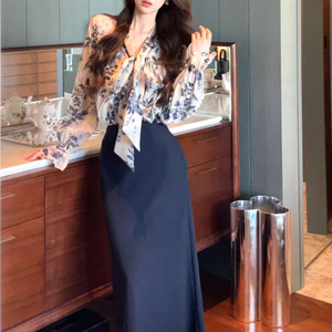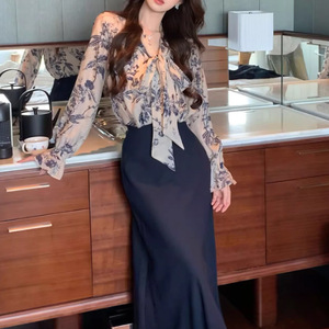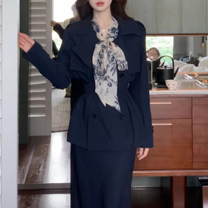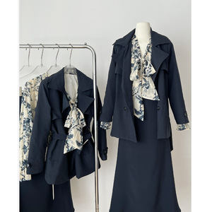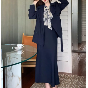 2025秋冬长袖印花雪纺衫上衣西装风衣外套半身裙套装女三件套女装