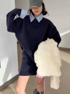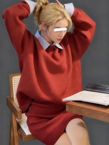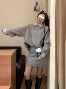 韩系休闲针织套装女2025秋冬新款衬衫领假两件毛衣高腰短裙两件套