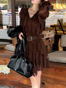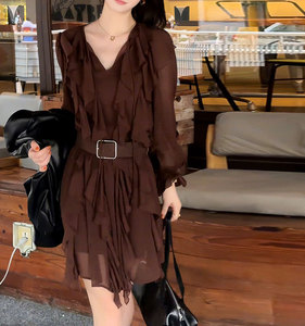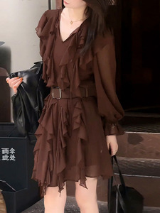 法式度假漂亮温柔风短裙气质高级感别致显瘦咖色荷叶边垂感连衣裙