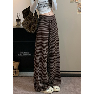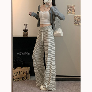 条纹抽绳松紧腰休闲裤女2025秋季新款慵懒风高腰显瘦阔腿直筒长裤