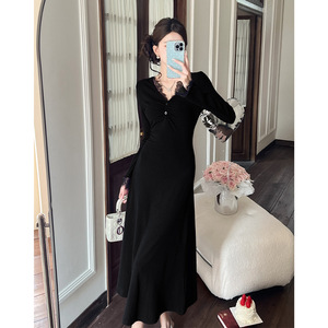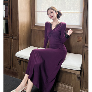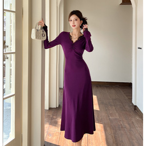 高级感紫色针织v领连衣裙女春秋季收腰显瘦中长款法式蕾丝百褶裙
