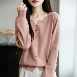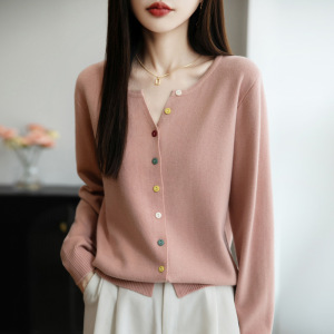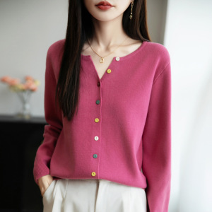 韩系彩色扭扣V领针织开衫女秋冬新款外穿圆领软糯纯色毛衣外套女