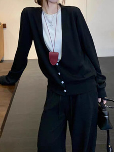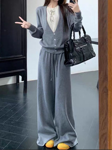 休闲套装女V领假两件上衣女长袖毛衣女2025秋季高腰阔腿裤两件套