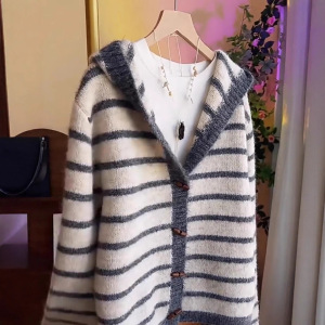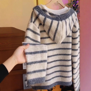 韩式条纹连帽橄榄扣毛衣开衫女秋冬慵懒风宽松撞色针织衫上衣外套