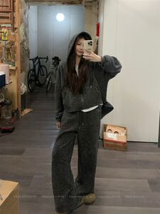 【工厂现货】螺纹抓毛秋冬套装宽松连帽条纹外套阔腿裤长裤两件套
