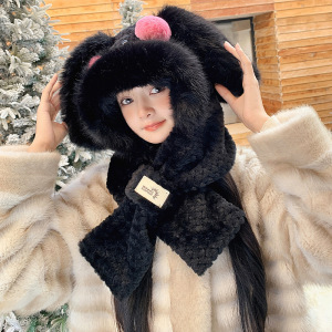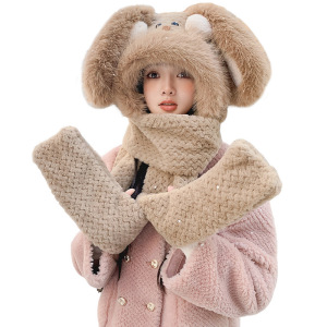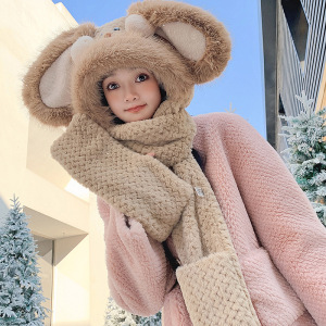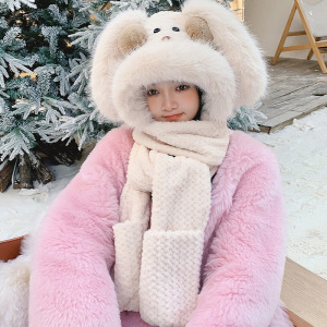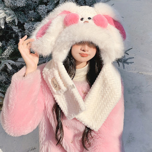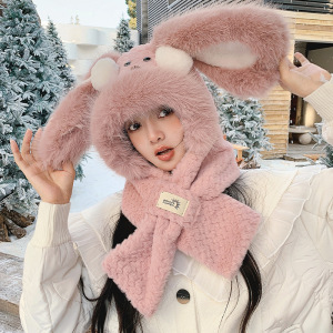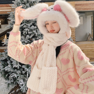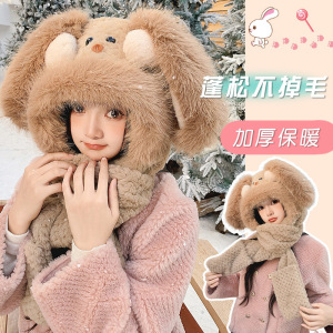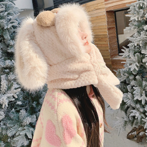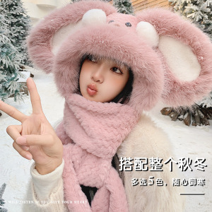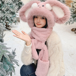可爱腮红兔子帽子围巾一体三件套女秋冬季毛绒绒加厚保暖围脖手套