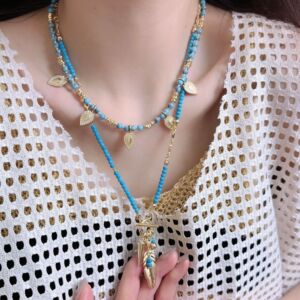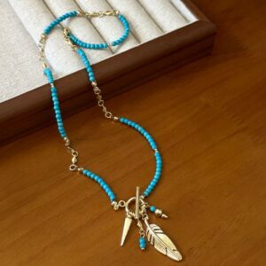 蓝色松石串珠树叶羽毛吊坠项链女新中式高级感时尚轻奢锁骨链配饰