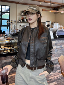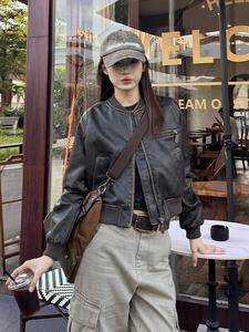 手工擦色美式短款机车皮衣夹克女新款复古拉德外套皮夹克百搭上衣