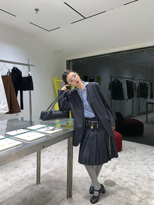 le rouge周美美 新学院主义蓝白格子可拆卸连帽翻领衬衫