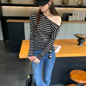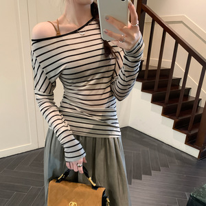 莱赛尔天丝设计感条纹斜肩长袖T恤女装美式2025早秋新款韩系上衣