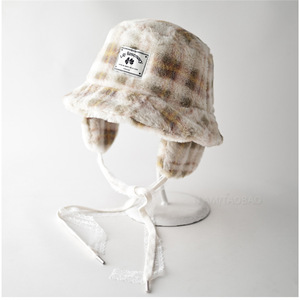 毛绒格子蕾丝绑带护耳渔夫帽黄