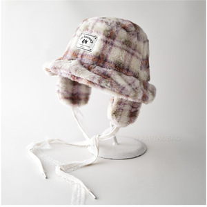 毛绒格子蕾丝绑带护耳渔夫帽粉紫