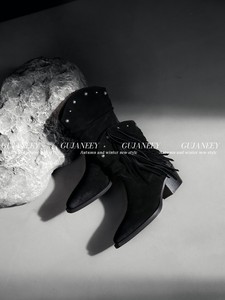 欧洲站女鞋25秋冬时尚流苏褶皱软牛猄皮尖头套筒粗低跟切尔西短靴