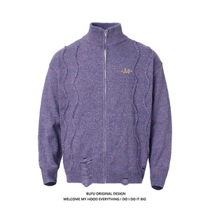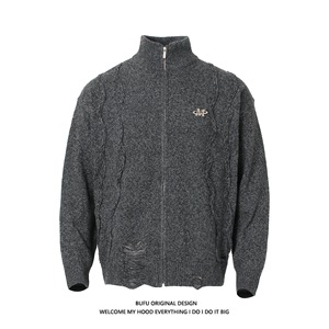 欧美小众慵懒风立领开衫毛衣秋冬季破洞复古麻花高级感针织衫上衣
