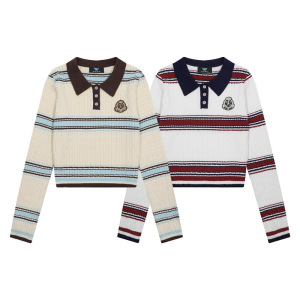 韩系条纹麻花学院风徽章翻领针织衫毛衣女辣妹短上衣2025秋季新款