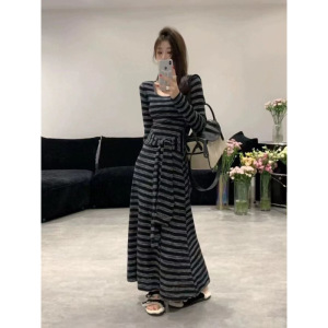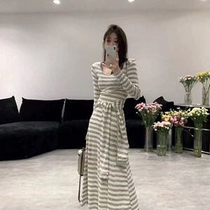 韩版复古条纹连衣裙女2025秋冬新款时尚气质百搭显瘦长袖打底裙子