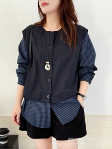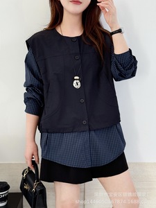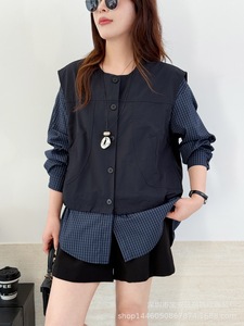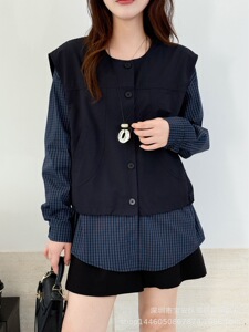 琪镌绘制韩系条纹拼接假两件马甲女秋季款宽松减龄长袖上衣85177