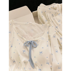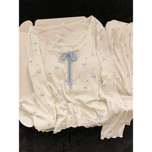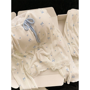 纯欲舒适棉带胸垫睡衣女春夏新款蕾丝花边蝴蝶结长袖家居服套装