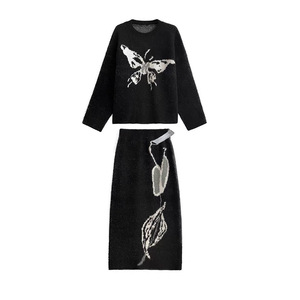 孕期穿搭2025秋冬国风新中式蝴蝶卷边套头针织毛衣半身裙两件套装