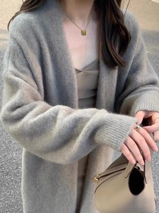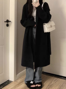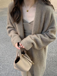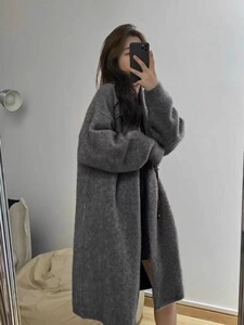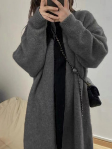 跨境慵懒风中长款羊毛开衫女秋冬新款韩系休闲过膝V领毛衣外套女