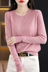 灰色气质长袖羊毛衫针织开衫女薄款早秋季上衣圆领毛衣外套