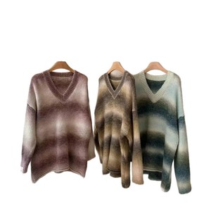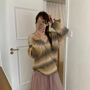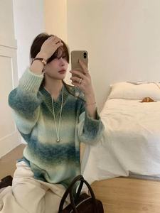 欧洲站2025新款宽松慵懒风渐变V领套头针织衫女软糯撞色时髦毛衣