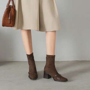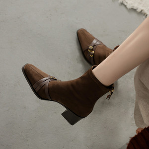 新款法式尖头高跟及踝靴交叉金属扣带弹力瘦瘦靴短靴女