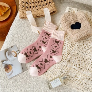 秋冬款厚袜子女中筒袜爱心新款加绒加厚毛圈保暖粉色蝴蝶结长袜