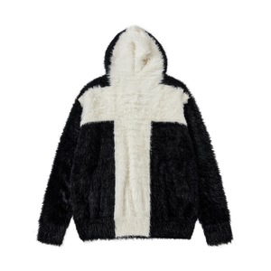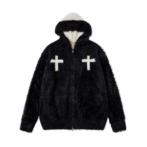 男士秋冬仿貂绒连帽针织外套潮牌撞色十字架加绒双头拉链开衫毛衣