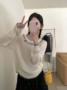 之言25秋冬女装羊毛衫韩系圆领甜美复古感绣花丝羊毛绒针织衫毛衣