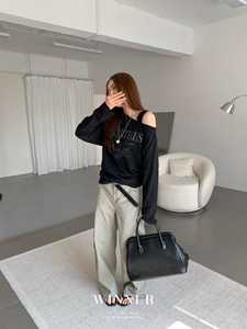 WINNER草莓家字母印花半露肩休闲T恤2025秋季宽松慵懒风长袖上衣