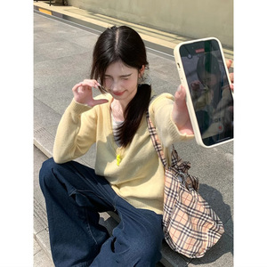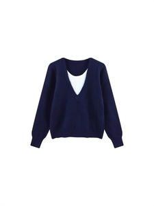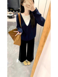 藏青色V领针织衫女秋季新款高级感内搭打底衫显瘦假两件长袖上衣