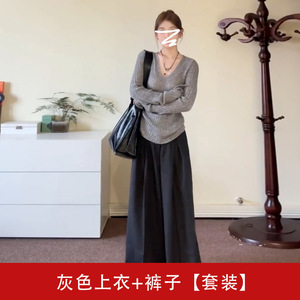 早秋穿搭一整套灰色针织衫宽松阔腿裤2025新款韩系氛围感穿搭套装