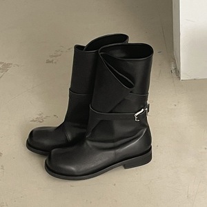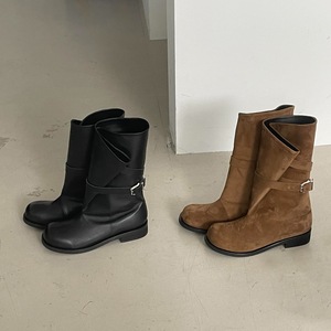 牛皮版~设计小众西部牛仔靴圆头宽筒翻折平底皮带扣短靴女骑士靴