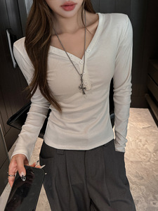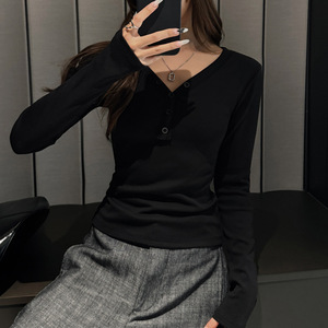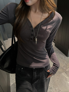 秋冬季磨毛V领纽扣设计高级感打底衫女内搭长袖t恤可外穿修身上衣