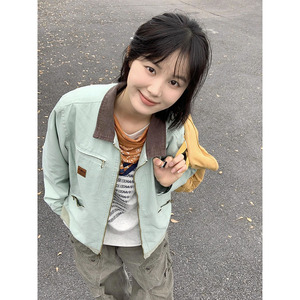 美式复古绿色翻领工装夹克女春秋小个子学生宽松休闲百搭棒球服外