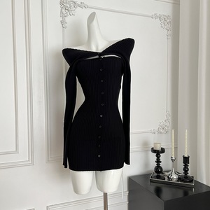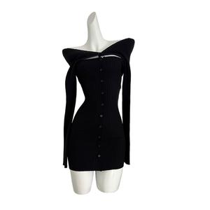2025实拍一字肩长袖连衣裙女秋季收腰辣妹包臀短裙修身显瘦裙子