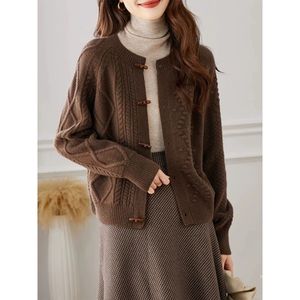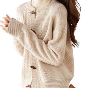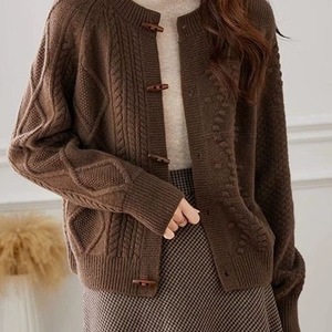 宽松麻花毛衣外套秋冬新款复古外穿通勤圆领牛角针织开衫显瘦上衣